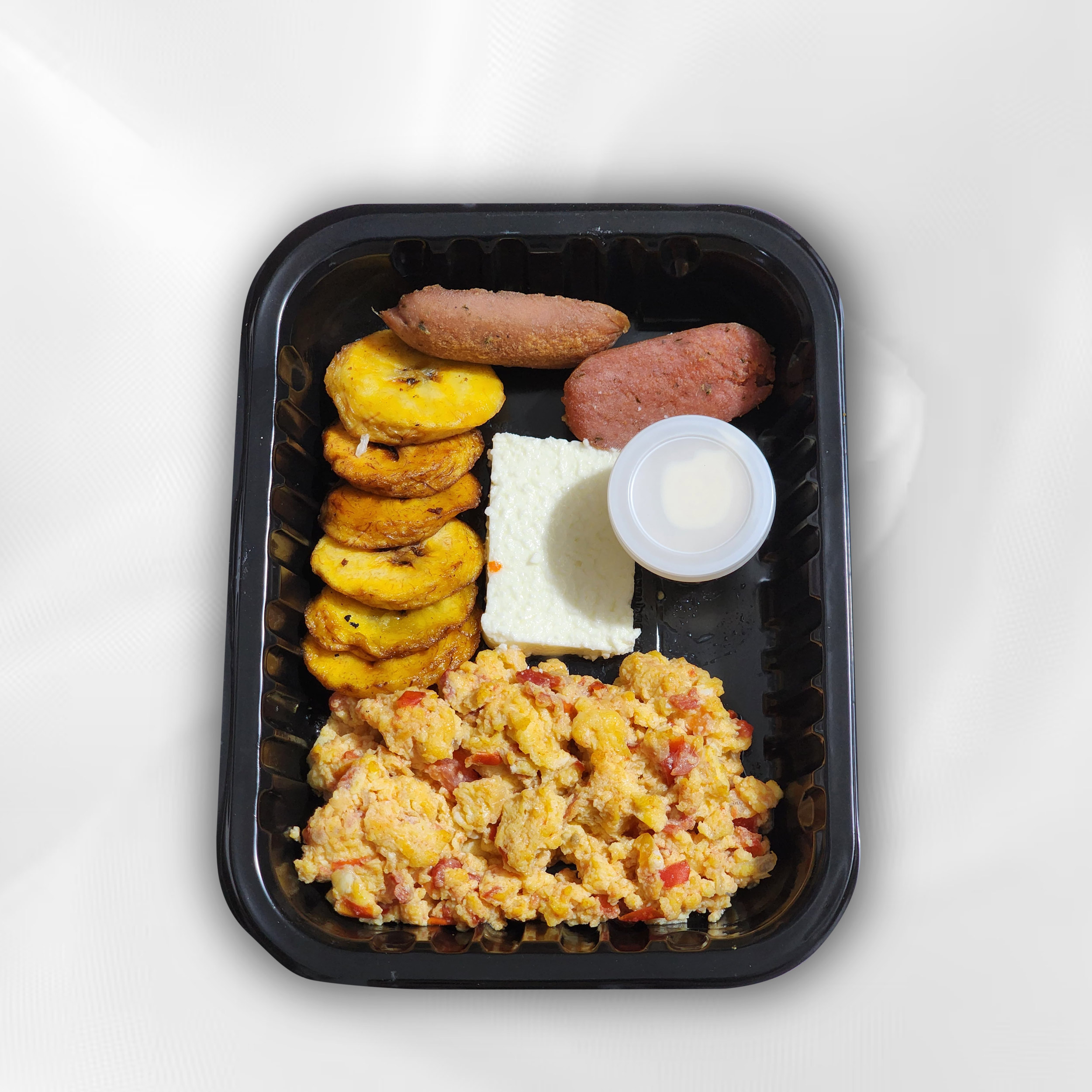 Deliciosos huevos revueltos acompañados de queso fresco, longaniza, platanos fritos, crema y chirmol.