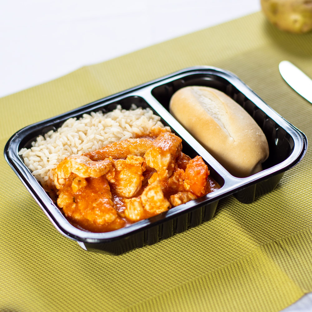 Pollo cocido a fuego lento con especias, papas y zanahoria en una salsa roja acompañado de arroz.